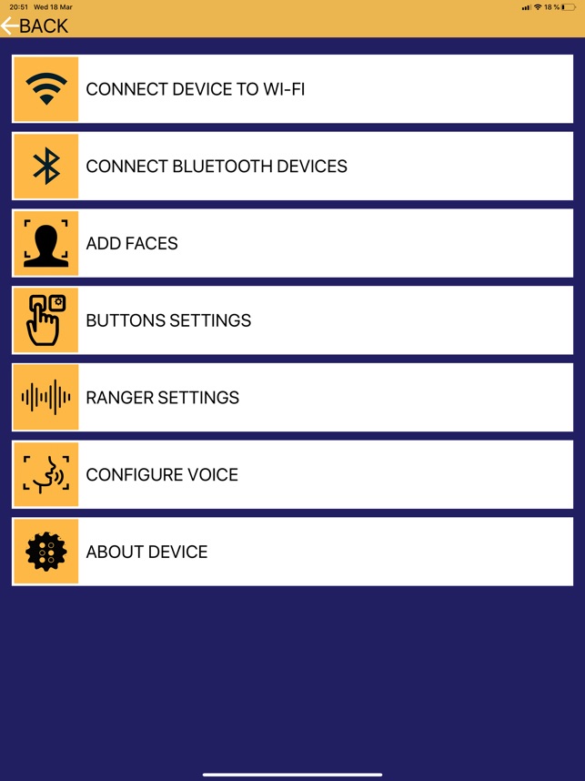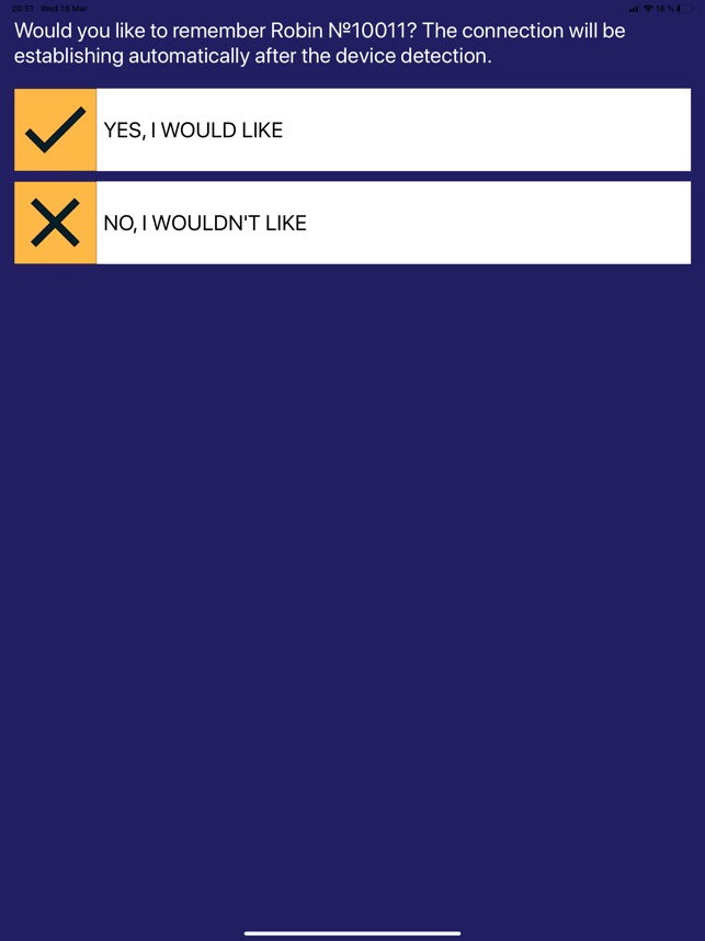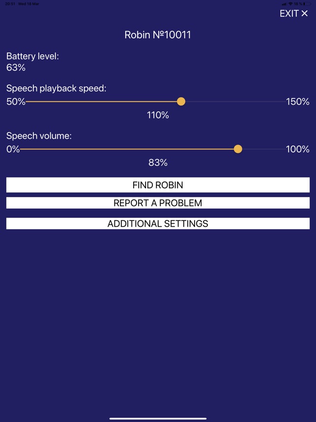 Smart cane Robin is an intelligent assistive technological device that helps the blind to follow the path of an active and accessible lifestyle with confidence. Robin is able to recognize objects and people, measure distance to them, memorize people's faces and voice their names, as well as warn the blind about obstacles via vibration alerts. These features allow the user to: • share household responsibilities with friends and relatives; • avoid unexpected obstacles; • find a person nearby and confidently turn to him; The application Robin is aimed at expanding the functionality of the device and its adjustment to the needs and habits of a blind user. The application can solely be used along the device and is specifically constructed for comfortable use with Voice Over or the whole Accessibility package. With the help of the application, the user will be able to perform the following actions: • increase the speed and volume of speech reproduction, change the speaker's voice from/ to male or female; • connect wireless headphones or speakers; • connect to the Internet; • upload faces of familiar people from the mobile device gallery.
